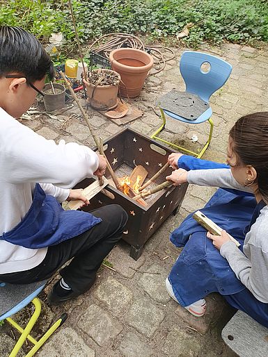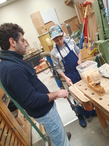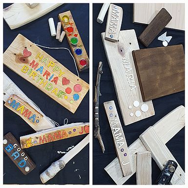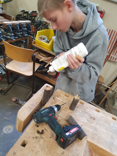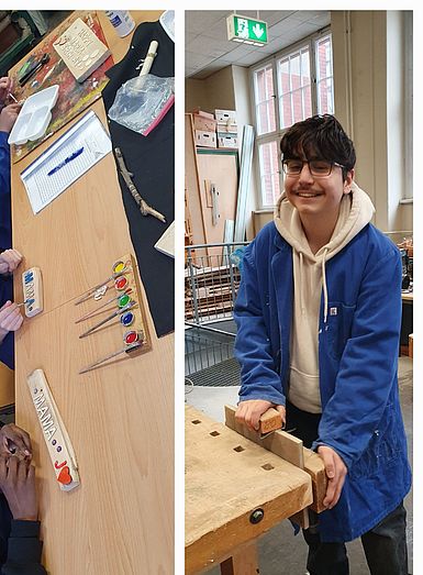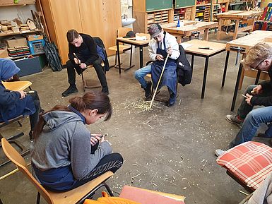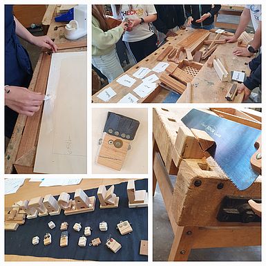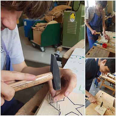 Beispiele für die Techniken Bohren, Hobeln, Sägen, Schnitzen und Zusammensetzen zur Holzbearbeitung durch die Schülerinnen und Schüler der Comenius-Schule sind auf den Bildern zu sehen.