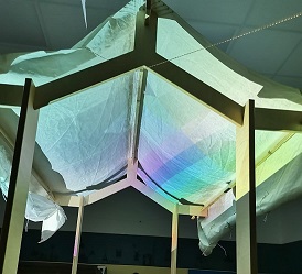 Alle haben mitgeholfen. Zuerst haben wir Mengen von Holzteilen geschleppt und diese zusammengesteckt, wie ein dreidimensionales Puzzle. Am Ende konnten wir darin sitzen und unsere Gedanken und Gefühle zur Geschichte austauschen: