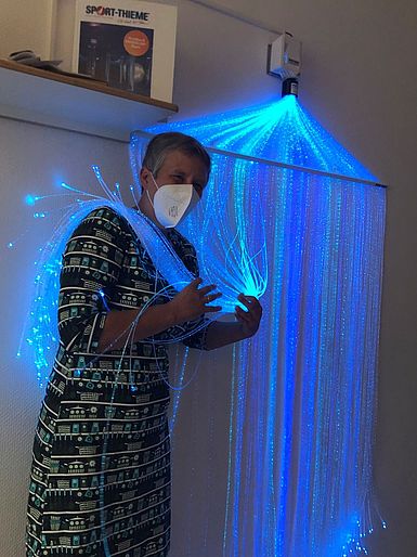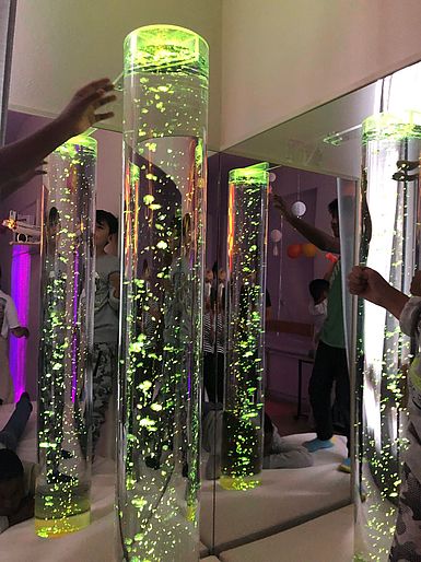 Am 17.8.2021 wurde unser neuer Snoezelraum feierlich eröffnet. Auf einer Plattform mit einer Blasensäule, Lichtprojektoren, Fasersträngen, zwei Sitzsäcken sowie weiteren Matten gibt es Platz zum Entspannen.