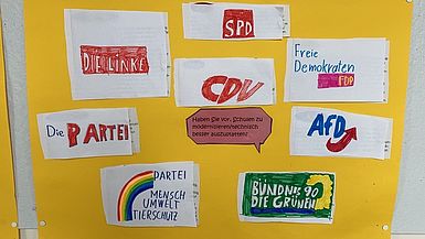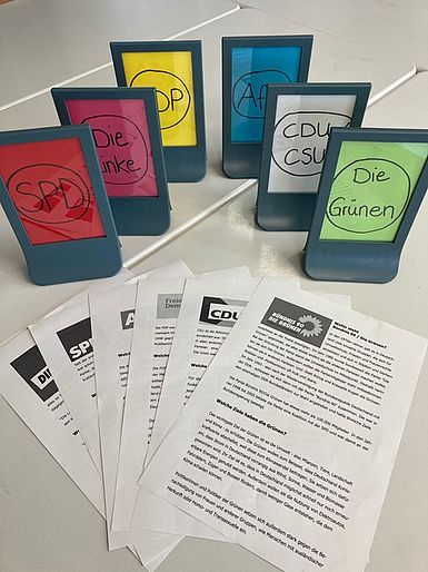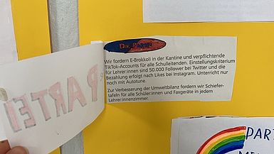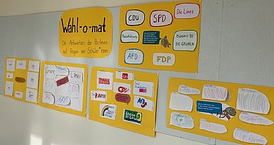 Um alle Klassen für die Juniorwahl fit zu machen und sie über die Bundestagswahl und die verschiedenen Parteien zu informieren, hat die Klasse B1 mehrere Wahl-o-mat-Poster für die Schule erstellt. Es freut uns sehr, bereits einigen Klassen auf dem Flur in der 4. Etage begegnet zu sein, die ganz konzentriert die verschiedenen (und teilweise sehr langen) Antworten der Parteien gelesen haben. Weiterhin sind alle Schüler:innen herzlich eingeladen, sich die Poster anzusehen und sich mit Hilfe der Wahl-o-mat-Poster über die Parteien zu informieren: