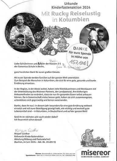Außerdem haben die Schülerinnen und Schüler der Klassen 2-5 von Frau Schmitt im Rahmen der Kinderfastenaktion 157,10 € gesammelt. Das Geld geht an Menschen in Kolumbien, die gemeinsam gesundes Essen selbst anbauen. Die Referentin der Kinderfastenaktion von misereor Mirjam Günther hat sich mit einer Urkunde bedankt.