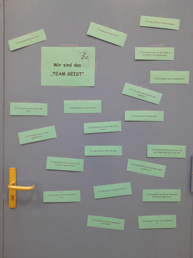 Unter dem Titel "Team Geist" hat die Klasse 2ic Geschicklichkeitspiele angeboten, die nur kooperativ lösbar waren. Ihre Lieblingsorte zum Lesen haben sie an der Klassentür ausgestellt.