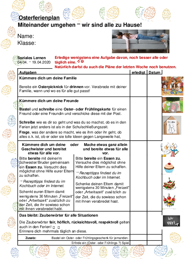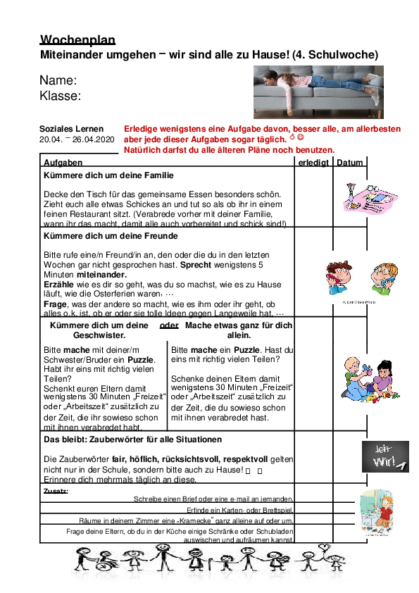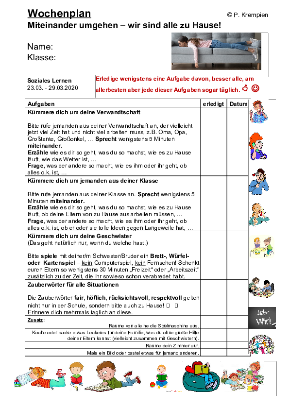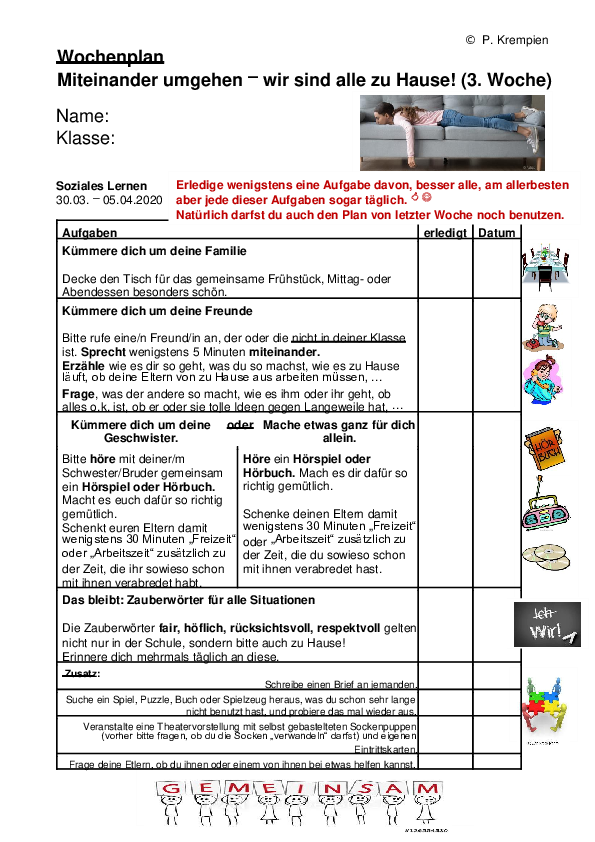 # CHALLENGE "50 Tage Fernunterricht“: Sammelt zu Hause 50 Dinge (50 Puzzleteile; 50 Klorollen stapeln; mit 50 Stickern ein Bild kleben; schreibe 50 Wörter auf, die Dir zu Corona einfallen; staple 50 Dosen; male ein Monster mit 50 Augen; drucke 50 Fingerabdrücke auf ein Blatt; denke Dir 50 Nettigkeiten für Deine Familie aus; backe eine Pizza mit 50 Zutaten).