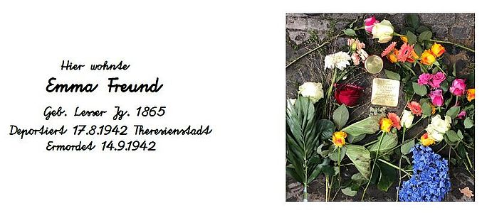 Hallo, ich heiße Luzie und ich bin für den Kontakt zu Didier Eisack verantwortlich. Emma Freund ist die Großtante von Didier. Er hat die Einsetzung organisiert. Alle aus meiner Klasse sollten eine Blume mitbringen. Ich hatte eine Hortensie. Zwischendurch hat eine Frau auf einer Klarinette etwas vorgespielt. Didier hat eine Rede gehalten. In der Rede hat er uns sehr gelobt. Er fand es toll, dass wir uns für so ein Thema interessieren. Angelika Ezzeldin (meine Nachbarin) hat für uns übersetzt. Didier kommt nämlich aus Frankreich. Dann durfte ich vorlesen, was auf dem Stolperstein stand.