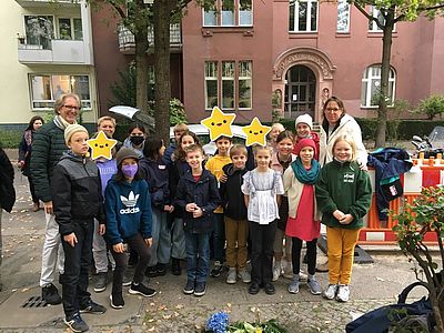 Hallo, wir sind die Kinder aus der Klasse 5ic. Wir berichten euch heute von der Stolperstein-Verlegung von Emma Freund. Wir wollen dieses Erlebnis mit euch teilen. Hier kommen unsere Eindrücke.