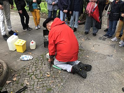 Ich fand es beeindruckend, wie viel Arbeit dahinter steckt. Es war erstaunlich, wie der Stolperstein verlegt wurde. Jeder musste eine Blume mitbringen. Und zum Schluss haben wir einen Schlüsselanhänger bekommen.